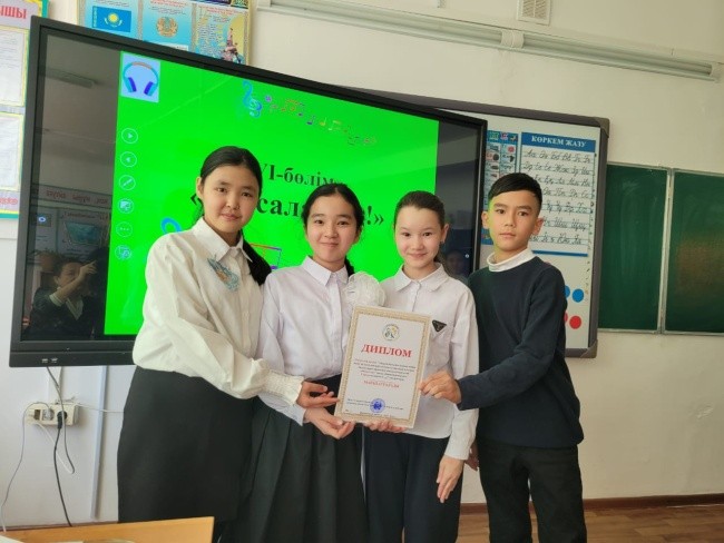 4 ақпан 2025 ж. музыка пәні мұғалімі Пірімжанова А. 6 сыныптар арасында «Әуенді тап»  сазды ойын сабағын  өткізді.  Сабақтың мақсаты: оқушылардың жан-жақты дамуына, әнге деген құмарлығын байқау, балалардың түрлі әуендерді білуі, есте сақтау деңгейлерін анықтау арқылы сазға деген сүйіспеншілігін арттыру.